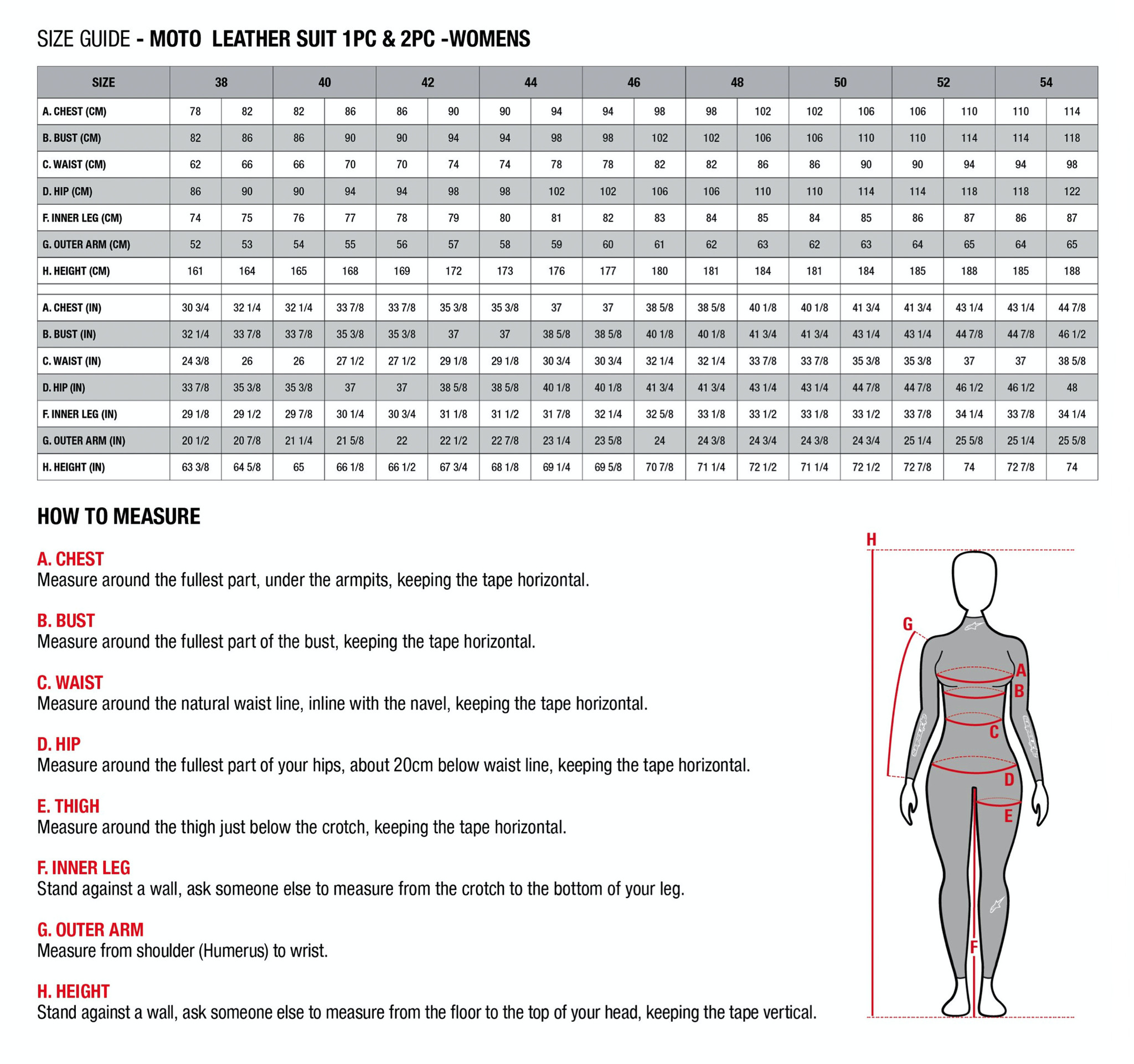 Via onderstaande tabellen kun je jouw maat vertalen naar dames motorkleding van Alpinestars. Maattabellen blijven altijd een indicatie voor een maat. Jouw perfecte maat is afhankelijk van vele aspecten. De maatinformatie hieronder wordt verstrekt door de fabrikant en garandeert geen perfecte pasvorm. Dus mocht je twijfelen, is passen altijd beter.